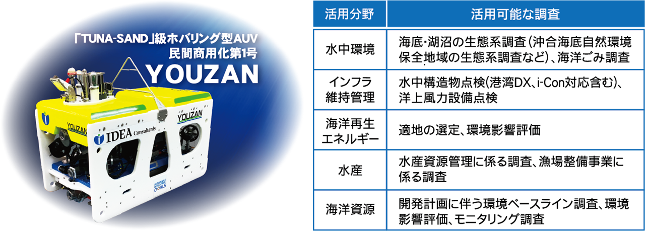 東京大学生産技術研究所が開発したホバリング型AUV「TUNA-SAND」クラスの民間商用化第1号となるAUVである。 東京大学生産技術研究所、九州工業大学社会ロボット具現化センター及び海上技術安全研究所より、技術移転を受け、民間として初めて導入した国産AUVである。 |