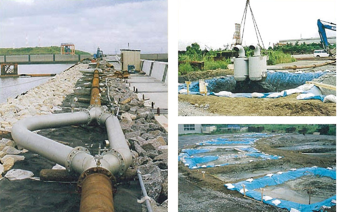 | 新素材、登録技術の特徴・利点 | 本工法は管中混合固化処理工法で、浚渫泥土の空気圧送管内に固化材スラリーを添加し、プラグ流の混練効果とW-管での混合・攪拌効果により、泥土と固化材を混練し、浚渫泥土を埋立材などとして有効利用するものです。 混練ミキサを使用しないために安価に、かつ大量に浚渫泥土の固化処理が可能であり、圧送船の大型化にも容易に対応できるリサイクル工法です。 |